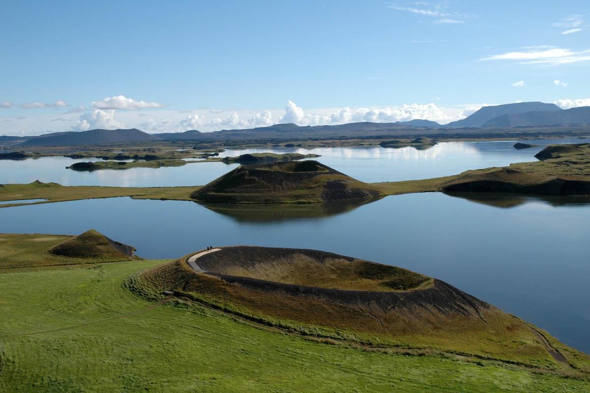 Утром – перелет на частном самолете на север острова, в район озера Миватн. Вы посетите местность Скутустадир, где можно полюбоваться загадочными псевдократерами. Вы также увидите причудливые лавовые формации Диммуборгир и вулканический кратер Кверфьятль.