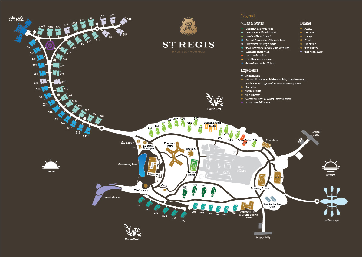 Первый отель бренда St.Regis на Мальдивах, St. Regis Maldives Vommuli Resort открылся в 2016 году. Он находится на собственном острове в атолле Даалу, в 45 минутах полета на гидроплане от международного аэропорта Мале. Площадь острова, на котором расположен отель – всего 9 гектаров.