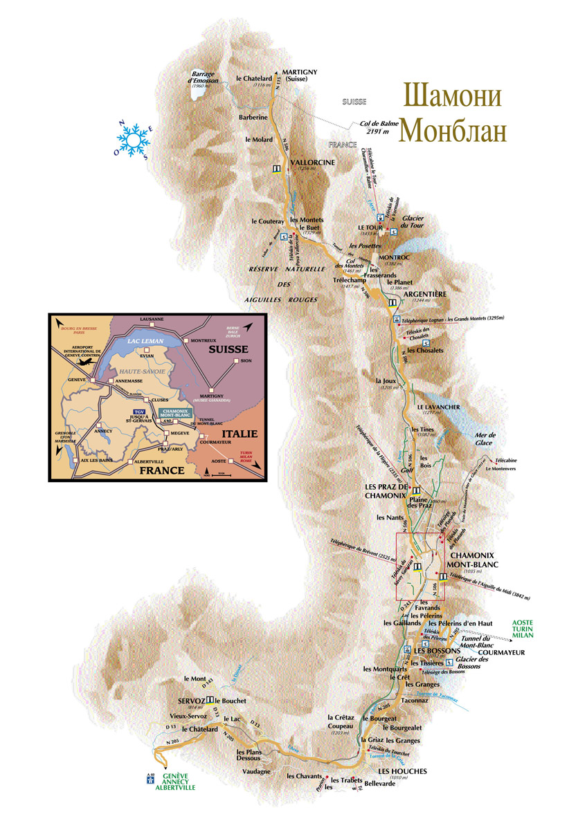 Курорт Шамони находится у подножия горы Монблан. Большой выбор трасс разного уровня в Шамони привлекает любителей и профессионалов. Здесь особенно много спортсменов в выходные дни, поскольку город расположен всего в 50 минутах езды от Женевы.