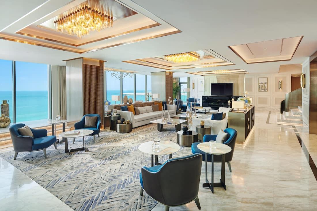 В отеле 256 номеров, в том числе 78 suites с видом на город или Персидский залив. Все номера оформлены в современном стиле, с панорамными окнами от пола до потолка; большинство из них – с балконом. Гостям клубных номеров и suites доступны привилегии эксклюзивного Club Lounge (отдельные чек-ин и чек-аут, обеденные зоны, пространство для отдыха, вечерние коктейли и т.д.). Самый роскошный люкс – Royal Penthouse (850 кв.м) с просторными спальней и гостиной, столовой, баром, кабинетом, тренажерным залом и парной, а также несколькими балконами и террасой на крыше с видом на залив; к номеру можно подняться на отдельном лифте.